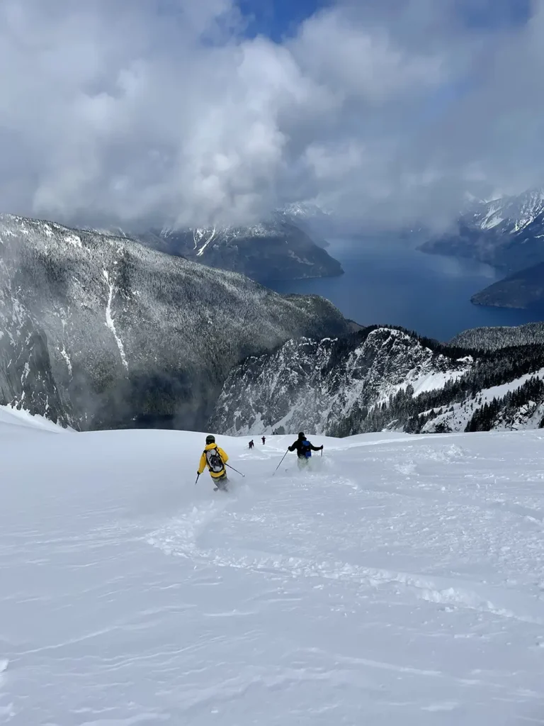 Directly across the inlet from the lodge, this zone offers quick access to a variety of excellent runs. While offering a mix of alpine and tree line skiing, this area offers some of the best tree skiing in our tenure. You can expect runs here to consist of 600 – 1,000 m of vertical drop and the skiing to be more focused on intermediate and above skiers. Also relatively unexplored, this is a zone offering the opportunity for many first descents.